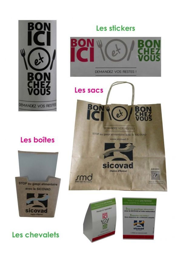 L’objectif étant de généraliser la pratique du “Doggy Bag” en restauration, le SICOVAD a créé une identité visuelle, afin de promouvoir l’opération : “BON ICI ET BON CHEZ VOUS”